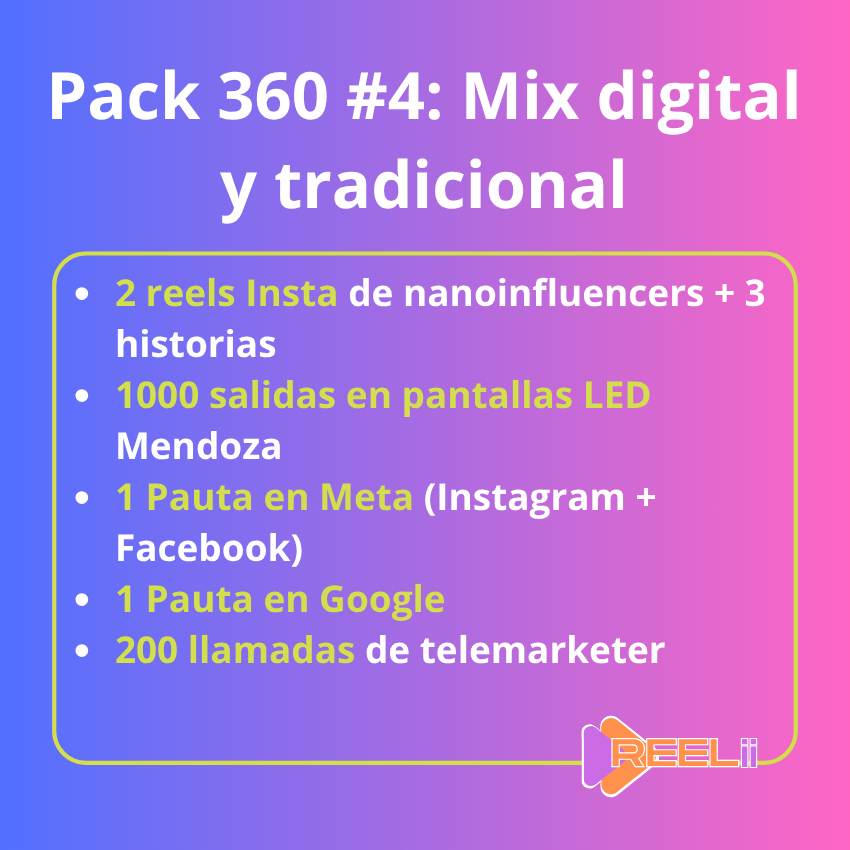 Este pack combina visibilidad masiva con acciones concretas de contacto y conversión. Las redes y Google Ads generan alcance digital, las pantallas LED refuerzan presencia local y las llamadas de telemarketing permiten hablar directamente con los interesados, aumentando la tasa de cierre.
